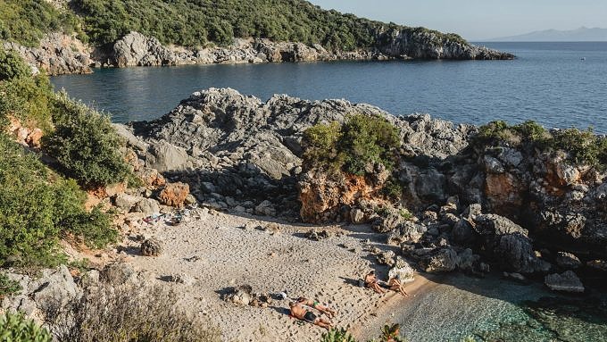 Für die Anfahrt zum Pulëbardha Beach muss man starke Nerven haben: Auf einem steilen, staubigen, ruckeligen Feldweg geht es kurz hinter der vom Butrint Nationalpark kommenden Hauptstraße hinab zu den Klippen, die steil ins babyblaue Wasser fallen. Wer erstmal unten angekommen ist, will dann aber so schnell nicht wieder weg: In einer kleinen, grün bewachsenen Bucht befindet sich ein wunderschön ruhiger Steinstrand, an dessen rechter Flanke zwei gemütliche Restaurants lokale Speisen servieren. Du solltest mindestens bis zum Abend bleiben und die Sonne hinter der griechischen Insel Korfu untergehen sehen.