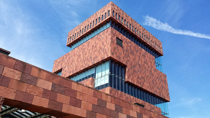 Das Hafenviertel gehört zu jedem Antwerpen-Besuch dazu, nicht nur wegen der Hafenbecken mit seinen unzähligen Schiffen, sondern auch, weil es hier einen der wohl schönsten Ausblicke über die Stadt gibt. In dem imposanten Speicherhaus mitten im Viertel Het Eilandje befindet sich nämlich das Museum aan de Stroom, kurz MAS. Auf dem Panoramadach in der zehnten Etage erwartet Besucher*innen ein überwältigendes Rundum-Panorama – und zwar umsonst. Im MAS kannst du nämlich nach Belieben ein- und ausgehen, nur wenn du die Museumssäle besuchen möchtest, musst du ein Ticket kaufen.