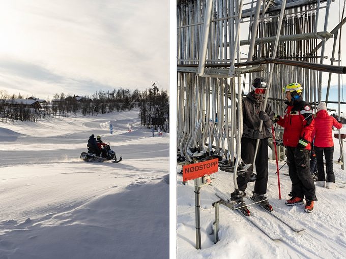Die Lifte sind so nah aneinander, dass die Insassen sich High fives geben können. Nachdem Olav die ersten Bügel ausgegeben hat, hüpft er auf den Skido – und nimmt mich kurzerhand mit. Mit dem Snowmobil fährt er die Strecke des neuen Liftes entlang, schaut dabei immer wieder nach oben zu den Liftstangen und checkt, ob alles reibungslos läuft. Er fährt schnell und relativ nahe an den Sportler*innen vorbei. Ich kralle mich mit aller Kraft an dem Sitz fest und bin etwas überrumpelt von der actionreichen Fahrt. Olav weiß, dass das das Gefährlichste an seinem Job ist. Deswegen, so erzählt er mir, braucht man für den Skido einen eigenen Führerschein.