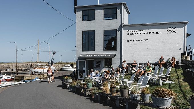 Wenn du einen dekadenten Nachmittag auf Bornholm verbringen willst, empfehlen wir dir im Bay Frost zwischen Svaneke und Gudhjem vorbeizuschauen. Mit Blick auf den denkmalgeschützten Listed Hafen kannst du hier an schönen Tagen draußen sitzen, Champagner und Gin-Drinks schlürfen sowie Lobster Rolls mit hausgemachter Mayonnaise und französische Delikatessen schlemmen. Im oberen Teil des Cafés befindet sich übrigens die Goldschmiedewerkstatt von Sebastian Frost, der das Café, du ahnst es, eröffnet hat.