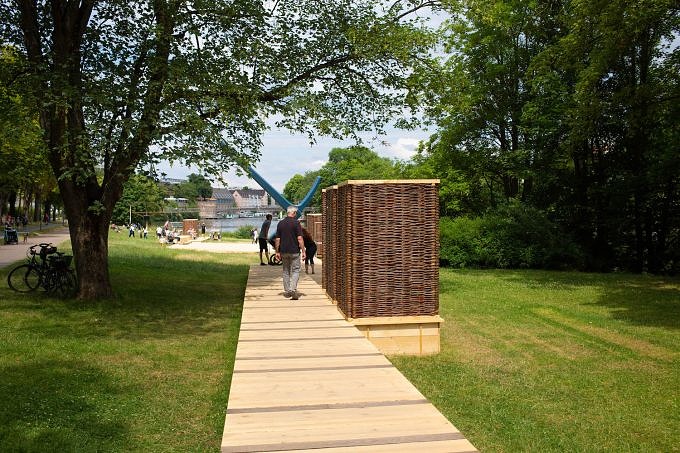 An vielen Orten im Kasseler Stadtraum begegnest du während der documenta den Themenwelten Reflektieren, Rasten und Besinnung. Einer dieser "reflecting points" ist das sogenannte Luftbad am Hiroshima-Ufer an der Karlsaue, das sich zwischen der Orangerie und der Drahtbrücke befindet. Initiiert wurde das Projekt von der BDA Gruppe Kassel. Das Luftbad soll während der Ausstellungszeit als öffentlicher Ort der Begegnung und der Erholung fungieren. Über einen hölzernen Steg, an dem sich aus Weiden geflochtene Kabinen zum Umziehen befinden, gelangst du an einen Sandstrand mit Sitzgelegenheiten direkt am Ufer der Fulda, der zum (Sonnen-)Baden einlädt. Der perfekte Ort, um auf deinem Streifzug durch Kassel eine Pause einzulegen und die Füße abzukühlen.