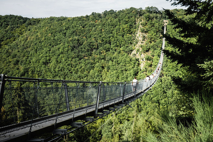 Durch das wunderbar grüne Moseltal schlängelt sich linksseitig des Flusses eine Straße mit leichter Steigung bis hoch auf das Mittelgebirge des Hunsrück. Hier oben spannt sich zwischen Mörsdorf und Sosberg die Geierlay Hängeseilbrücke auf. Auf 360 Meter Länge überquert die atemberaubende Stahlkonstruktion das Mörsdorfer Bachtal und gibt den Blick frei auf die bewaldeten Hänge rund um den Bach. Wer schwindelfrei den Blick schweifen lassen kann, erfährt ein erhabenes Gefühl von Freiheit. Der Eintritt ist übrigens frei, allerdings empfehle ich einen Besuch morgens oder abends, dann ist das Licht am schönsten und die Touristenmassen sind verschwunden.