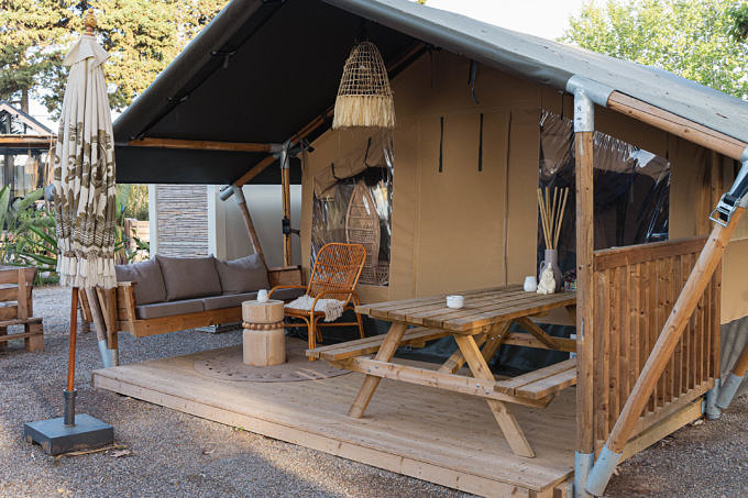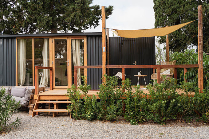 Du kannst hier aus verschiedenen Unterkünften wählen: Stylische Tiny-Häuser mit Küche, Bad und Terasse oder große, etwas spartanischer ausgestattete Glamping-Zelte – jeweils für Familien mit maximal vier Personen.