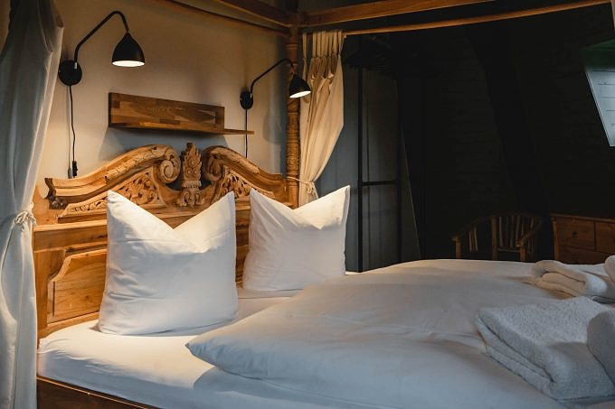 Bei der Ausstattung legte Foster viel Wert auf hochwertige Möbel und technische Geräte sowie natürliche Materialien wie Holz und Keramik. Herausragend sind vor allem die beiden wunderschönen Himmelbetten in den Schlafzimmern: Das eine wurde aus nachhaltigem Holz in Indonesien handgeschnitzt, das andere stammt aus einem Second-Hand-Geschäft in Berlin. Nachhaltigkeit hört bei der Ausstattung aber nicht auf: Im Zuge der Sanierung ließ Foster eine Eichen-Allee pflanzen, die den Feriengästen in der Einfahrt den Weg zur Mühle weist. Darüber versickert das Abwasser über eine biologische Kläranlage in den Boden.