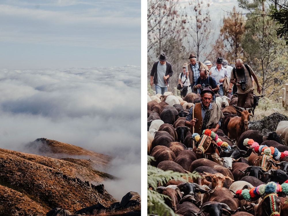 Kurz nach 8 Uhr hat sich die Sonne auch in Seia langsam durch die Wolken gekämpft und verspricht einen sonnigen Tag. Plötzlich wird es laut und unruhig in den Straßen. Der erste Hirte zieht mit seiner Herde auf dem Platz ein, begleitet vom lauten Glockengeläut seiner Tiere. Bunt geschmückt, mit Wollbommeln und Schleifen, zieht das Vieh an den begeisterten Zuschauer*innen vorbei. Immer mehr Hirten finden sich nun am Rathausplatz ein, stets begleitet von den Cão de Serra de Estrela, den charakteristischen Hirtenhunden der Region. Hunderte Schafe und zahlreiche Glocken sorgen für ein buntes Treiben und froh klingendes Geläut in dem sonst beschaulichen Bergdorf. Als die letzte Herde den Platz erreicht, setzen sich die Hirten in Bewegung, um ihr Vieh in die Berge zu treiben. Einheimische und Familien mischen sich unter die Herden und begleiten den Auftrieb in vergnügter Stimmung.