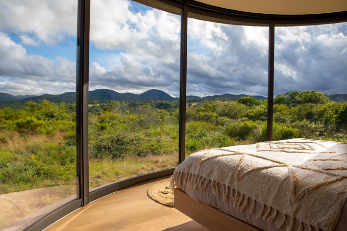 Auf den ersten Blick wirkt das mit dunklem Holz ummantelte Gebilde eher unscheinbar, doch wer genauer hinsieht, erkennt die naturorientierte Idee dahinter. Die minimalistische Konstruktion erscheint wie eine Fusion aus einfachem Tiny House und luxuriösem Penthouse, das nicht wie gewohnt auf dem Dach, sondern ebenerdig gelegen ist. Doch die Aussicht ist nicht weniger spektakulär. Denn in den kompakten Kokon wurde ein gigantisches Panoramafenster aus gebogenem Glas eingebaut, das den modernen Innenraum und die natürliche Außenwelt miteinander verschmelzen lassen.