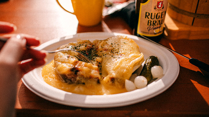 Das Chasbratel ist neben dem allseits bekannten Käsefondue eines der traditionellsten Schweizer Gerichte. Natürlich gibt es auch beim Chasbratel viel Käse, nämlich auf einem Stück Brot Käse. Ganz typisch isst man das Brot mit dem zerlaufenen Käse auf PistenhüttenFestivals oder Dorffesten. Serviert wird es meistens mit kleinen Silberzwiebeln und Essigürkchen. Eine perfekte Grundlage nicht nur auf dem Dorffest, sondern auch vor der nächsten Abfahrt. Besonders gut kann man sein Chasbratel im Jägerstübli auf der Lompachalp geniessen. Während der Käse beim Abbeißen Fäden zieht, kann man hier die schöne Aussicht auf die Berge bestaunen.