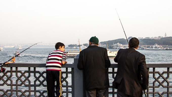 Die Galatabrücke in Istanbul, die über das Goldene Horn führt, ist eine kleine eigene Welt für sich. Oben stehen Fischer dicht an dicht und werfen ihre Angeln aus. Auf der unteren Ebene der Brücke reihen sich die Restaurants aneinander und der Blick auf Istanbul nördlich und südlich des Horns ist wunderschön, auch wenn der Spaziergang über die Brücke eine kleine Herausforderung für empfindliche Nasen ist.