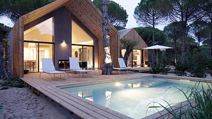 Die Apartments von Sublime Comporta sind eine moderne Abwandlung der traditionellen Cabanas, in denen früher noch Fischer und Bauern genächtigt haben. Luxuriös und komfortabel ausgestattet bietet die minimalistische Architektur mit viel Holz und Glas einen atemberaubenden Ausblick auf die schöne, leicht hügelige Umgebung. Von hier aus blickt man auf Schirmkiefern, Korkeichen und Sanddünen, die das Herz im gemeinsamen Zusammenspiel höher hüpfen lassen. Besonders ist auch das Bio-Restaurant mit offener Küche, die im Zentrum des Gartens steht. Hier passen bis zu 12 Personen an die Theke, mit denen man unter einem sternenklaren Nachthimmel schnell ins Gespräch kommen kann. Zum Beispiel während man den Köchen dabei zusieht, wie sie die alten, traditionellen Kochmethoden anwenden, bei denen Feuer eine wesentliche Rolle spielt. Von Juni bis September bietet die Unterkunft einen kostenlosen Kinderclub mit Betreuung sowie einen eigenen Kinderpool. Vor allem Familien mit engem Bezug zur Natur sind hier gut aufgehoben, denn zu den speziellen Familienangeboten zählen etwa Radtouren, Vogelbeobachtungen, Pferdereiten, Delphinbeobachtungen und mehr.