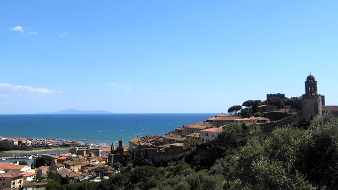 Hast du die Lagune von Orbetello durchquert, wartet sogleich das nächste Highlight: die Halbinsel Monte Argentario, nur durch drei schmale Landzungen ans Festland gebunden. Der Begriff „Monte“ ist korrekt, denn mit über 600 Metern über Meereshöhe ist der Argentario ein veritabler Berg. Dementsprechend erlaubt er nach einer kurzen Wanderung weite Blicke über das Meer und die umgebenden Inseln sowie eine eindrucksvolle Sicht auf die Lagune von Orbetello. Baden kannst du auch noch: Die Hafenorte Porto Ercole und Porto Santo Stefano verfügen über herrliche Fels- und Kiesstrände.