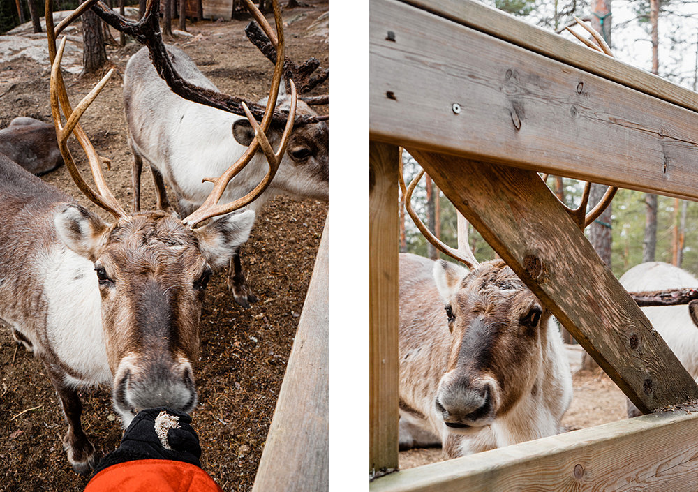 Im Park gibt es eine kleine Plattform, auf der die Touristen die Rentiere mit Flechte füttern können. Auch hier gibt es eine Rangfolge: Kein Tier drängelt sich dazwischen, der Reihe nach gehen Männchen und Weibchen an dem Holzzaun entlang und rupfen die Flechte aus den Händen der Besucher. Wer mehr Zeit mit den liebevollen Tieren verbringen möchte, kann auch ein Rentier-Trekking durch den Nuuksio Nationalpark buchen. Oder man übernachtet in einer der kleinen hölzernen Hütten, die auf dem Gelände stehen. Wenn die Rentiere neugierig genug sind, kommen sie ans Fenster und lassen sich direkt vom Bett aus füttern, während man selbst noch den Morgenkaffee trinkt.