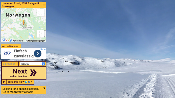 Eine dicke Schneeschicht bedeckt eine mir unbekannte Hügellandschaft. Ich drehe den Zeiger um 90 Grad und sehe, dass im Hintergrund die Sonne hinter den Bergen untergeht und die Landschaft am Horizont in zarte Pastelltöne taucht. In der Ferne kann ich ein paar einzelne Tannen im Tal entdecken, doch von urbanem Leben gibt es keine Spur. Gefällt mir! Sofort kann ich das Fernweh in mir spüren. Ich sollte wohl mal dort hinfahren, doch wo ist dieser Ort eigentlich? Ich schaue auf die Ortsnennung im oberen linken Feld: Skeisvegen 1130, 2652 Svingvoll – am Fuße der norwegischen Gebirgskette also. Ich drücke noch einmal auf den Button "next random location" und lande wieder in den Bergen – diesmal sieht es weitaus wärmer aus und ich kann ein undefinierbares Tier erkennen, das gerade im Dschungelartigen Grün verschwindet. Doch auch hier scheint keine Stadt in der Nähe zu sein. Unglaublich, welche abgelegenen Straßen und peripheren Regionen Google schon mit den eigenen Street-View-Autos erkundet hat. Doch für einen Trip um den Globus musst du nicht unbedingt ins Auto steigen, Snacks einkaufen oder ein Reisebudget einplanen, denn auf der Website Random Street View kannst du ganz easy eine virtuelle Überraschungsreise von Zuhause aus unternehmen.