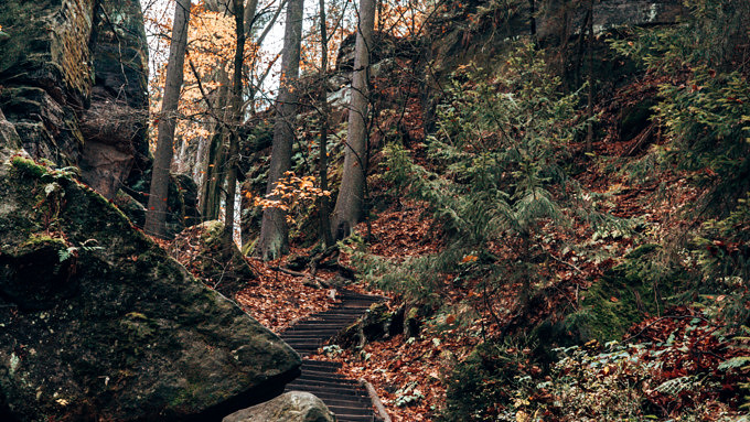 Das Gebiet der Sächsischen Schweiz ist geprägt von zahlreichen, schwer zugänglichen Schluchten, die sich durch die steil aus dem Boden ragenden Felsen ziehen. Die bekannteste ist dabei die klammartige Seitenschlucht mit dem ungewöhnlichen Namen "Schwedenlöcher", die das Felsmassiv Bastei mit dem Amselgrund verbindet. Der Wanderweg wurde bereits 1886 eingeweiht und führt auf über 700 Holzstufen und zahlreichen Brücken mehrere Hundert Meter in die Tiefe oder Höhe, je nachdem, von wo aus man die Wanderung beginnt. Im Frühling und Sommer ist die Strecke hochfrequentiert, im Herbst und Winter hast du die Schlucht fast für dich allein. Wenn du die Stufen lieber hinab als hinauf gehen willst, solltest du an der Bastei in Richtung Amselgrund starten.