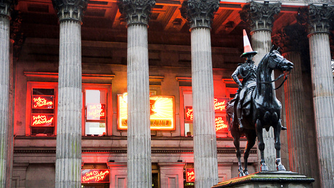 Vor der Gallery of Modern Art steht der beste Beweis für den Glasgower Humor. Die Reiterstatue vom Duke of Wellington trägt eine Pilone auf dem Kopf und ironisiert so irgendwie die ganze Idee vom Museum als heiligen Ort. Wer Lust auf Kunst hat, sollte unbedingt in die Gallery of Modern Art gehen. Für alle Kunstvergnügten ist Glasgow auf jeden Fall eine Reise wert. Im GoMa gibt es auch moderne Kunst von vielen schottischen Künstlern zu sehen. Unter anderem bringt einen dort David Shrigley mit ein paar wunderbaren Illustrationen zum Lachen. Irgendwie ganz entspannt, wie locker hier mit Kunst umgegangen wird. Da könnten sich die Berliner Museen eine Scheibe von abschneiden.