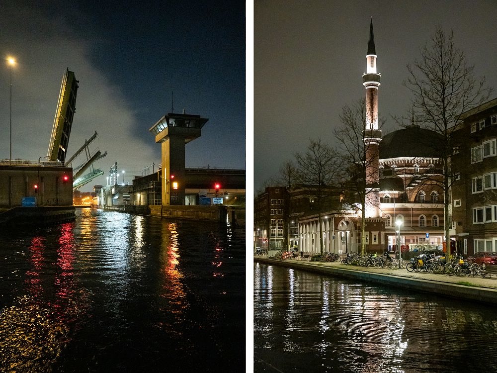 Die Brücken werden manuell geöffnet, das bedeutet, dass mehrere Brückenwärter*innen auf Fahrrädern neben uns den Kanal entlangfahren und eine Brücke nach der anderen für uns hochgeklappt wird. Trams, Busse, Autos, Fahrradfahrer*innen und schaulustige Passant*innen – sie alle müssen auf uns warten. Die Fahrt durch das nächtliche Amsterdam ist unglaublich. Berühmte Gebäude leuchten still in der Entfernung, wir passieren eine Windmühle sowie eine hell erleuchtete Moschee. Die Autobahnbrücke vor dem Nieuwe Meer öffnet sich in apokalyptischer Atmosphäre kurz vor Sonnenaufgang. Jetzt nur noch die Brücke bei Schiphol und unsere Fahrt durch flaches Land kann weitergehen.