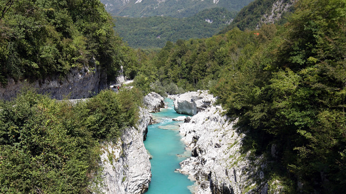 Das Vrata-Tal im Norden Sloweniens liegt mitten im Trigalv Nationalpark den du auf jeden Fall erkunden solltest, wenn du in der Gegend bist. Um den Blick auf die spektakuläre Nordwand des Triglav, dem höchsten Berg Sloweniens, zu genießen, kannst du das Vrata-Tal entweder mit dem E-Bike, wandernd, mit dem Bus oder dem eigenen PKW erkunden. Auf dem Weg durch das elf Kilometer lange Tal kommst du an auch den Peričnik Wasserfällen vorbei, die du mit festem Schuhwerk und ein bisschen Kondition erklimmen kannst. Hier kannst du sogar hinter dem 52 Meter hohen Wasserfall laufen und ganz nah an den Wassermassen stehen.