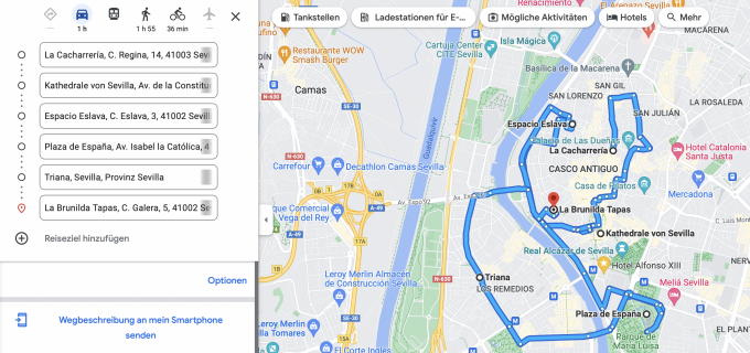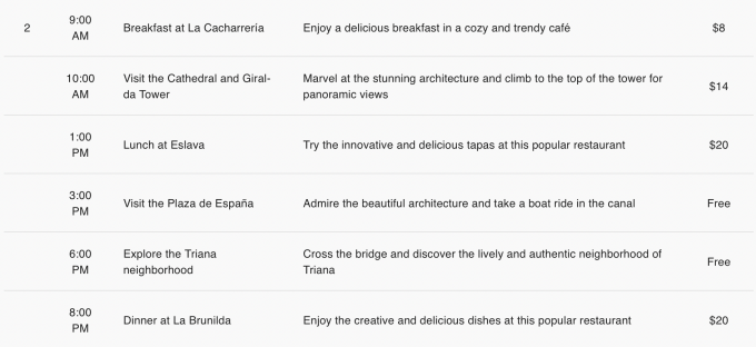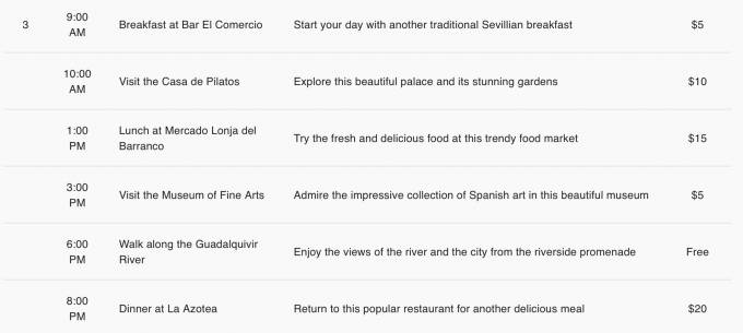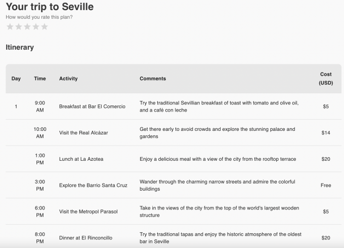 Da ich erst kürzlich drei Wochen in Sevilla verbracht habe, wollte ich wissen, welche Empfehlungen Trip planner AI für eine viertägige Reise in die andalusische Hauptstadt bereitstellt. Als Budget pro Tag habe ich 60 Dollar angegeben (Euro gibt es als Option nicht). Den kompletten Plan kannst du dir hier anschauen.