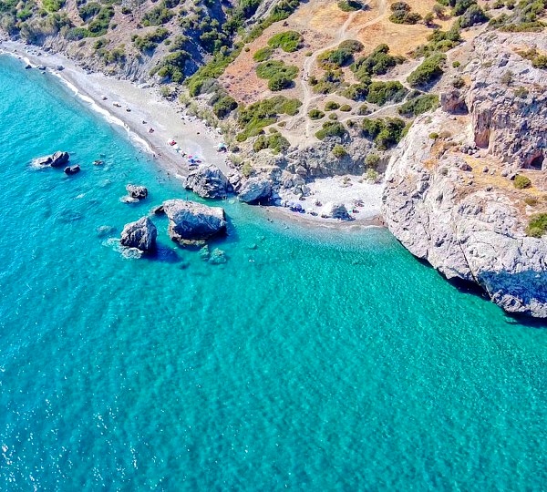 Im Südosten Kretas kannst du noch viele einsame Buchten finden. Wir können dir unter anderem den Strand von Stáousa (Kalo Nero) empfehlen, an dem du ganz ungestört in kristallklarem Wasser schwimmen kannst. Anschließend lohnt sich ein Besuch in der Tavern Oasis, die direkt an der Küste liegt, frischen Fisch serviert und einen herrlichen Blick auf das Meer gewährt. In den Wintermonaten hat die Gaststätte meist einige Wochen geschlossen, alternativ kannst du die im Nachbarort gelegene Dragon's Cave Tavern ansteuern – der Ausblick ist fantastisch, vor allem zum Sonnenuntergang.
