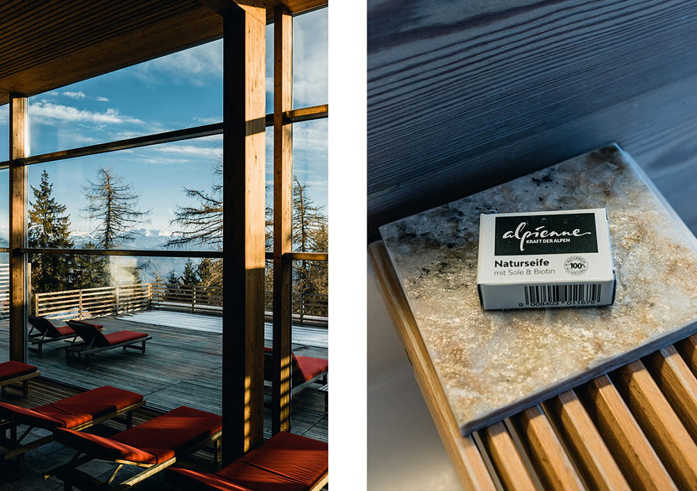 Um zum Hotel zu gelangen, müsst ihr nämlich im kleinen Dorf Lana die Seilbahn zum Vigiljoch nehmen. Passenderweise fährt diese nur alle 30 Minuten, sodass man direkt beim Ankommen entspannen muss. Schneller geht's einfach nicht. Sobald man in der Seilbahn sitzt und das Tal und die Weinberge der Region hinter sich lässt, schaltet der Kopf langsam aus und der digitalgetriebene Puls fährt herunter. Zwar ist der Empfang auf 1500 Metern erstaunlich gut, aber das vigilius mountain resort verfolgt einen leichten Digital-Detox-Ansatz. So wird für einen strahlenfreien Schlaf das WLAN ab 23 Uhr abgeschaltet, das Spa, die Piazza und das Restaurant des Hotels sind Smartphone-freie Zonen und überall stehen kleine Boxen, in denen man sein Handy einschließen kann. In den Zimmern befinden sich keine Fernseher und darüber hinaus bietet das vigilius die Möglichkeit, das Handy für die Länge des Aufenthalts gleich am Empfang abzugeben, was ich wirklich empfehle, denn dadurch wird der Aufenthalt hier oben noch intensiver.